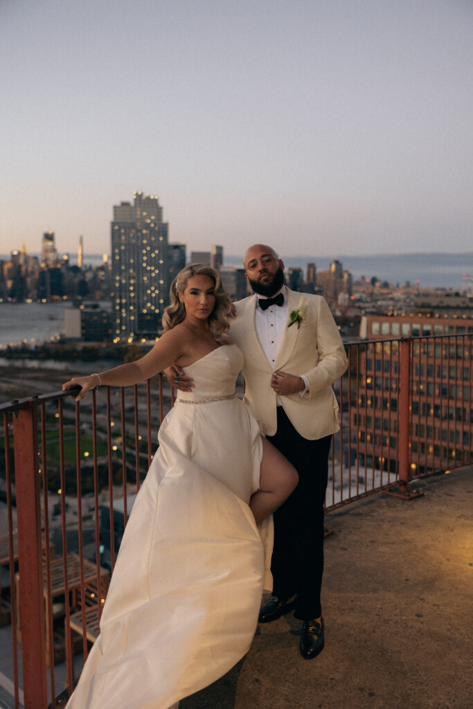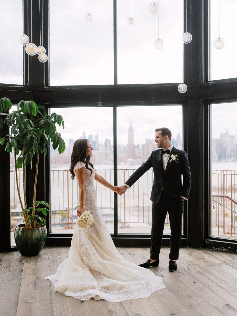 The Studio Suite features floor-to-ceiling windows with NYC views, a private balcony, reclaimed oak floors, a king-sized bed, and a spacious soaking tub. This is an ideal space for getting ready and capturing pre-ceremony moments.